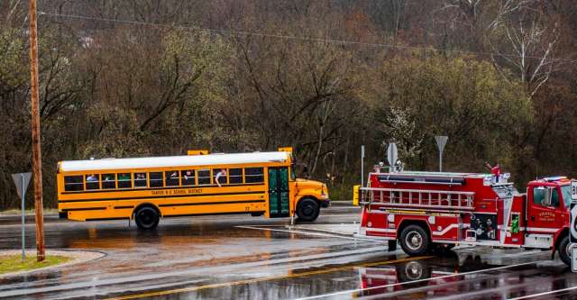 Despite it being a rainy and cloudy day, the city of Thayer did not disappoint the team. The escort included four police cars and two fire trucks. At the caution light, another police car had stopped traffic so the bus could drive by. Another police car and an ambulance also escorted them out of town.